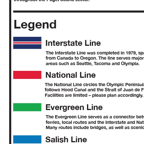 I divided the routes into five "lines" - Interstate, National, Evergreen, Salish and Local. These represent the freeway, US Highway, state highways, and ferries across Puget Sound.